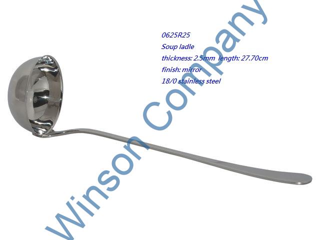 0625R25-Soup ladle ← Previous Next → 0625R25 Soup ladle thickness: 2.5mm length: 27.70cm finish: mirror Soup ladle thickness: 2.5mm length: 27.70cm finish: mirror 18/0 stainless steel