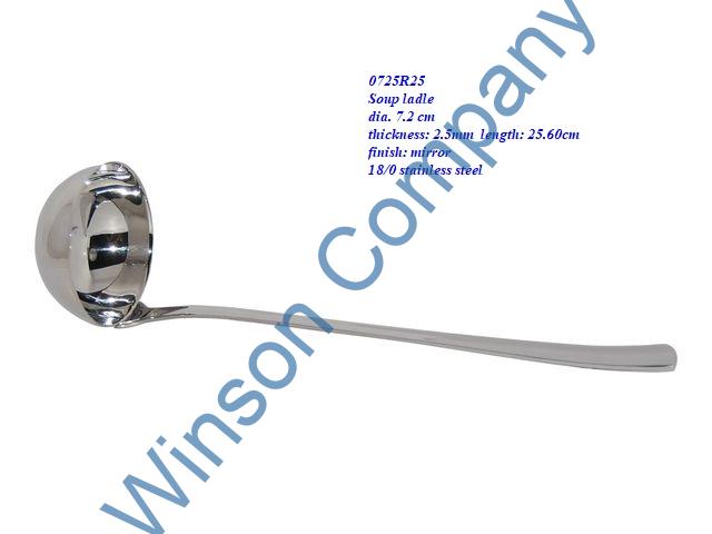 0725R25-Soup ladle ← Previous Next → 0725R25 Soup ladle dia. 7.2 cm thickness: 2.5mm length: 25.60cm finish: mirror Soup ladle dia. 7.2 cm thickness: 2.5mm length: 25.60cm finish: mirror 18/0 stainless steel
