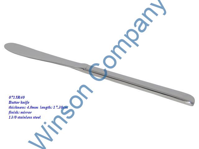 0715R40-Butter knife ← Previous Next → 0715R40 Butter knife thickness: 4.0mm length: 17.30cm finish: mirror Butter knife thickness: 4.0mm length: 17.30cm finish: mirror 13/0 stainless steel