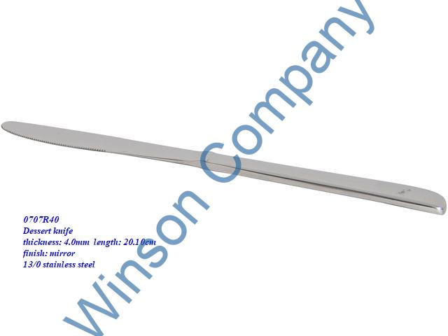 0707R40-Dessert knife ← Previous Next → 0707R40 Dessert knife thickness: 4.0mm length: 20.10cm finish: mirror Dessert knife thickness: 4.0mm length: 20.10cm finish: mirror 13/0 stainless steel