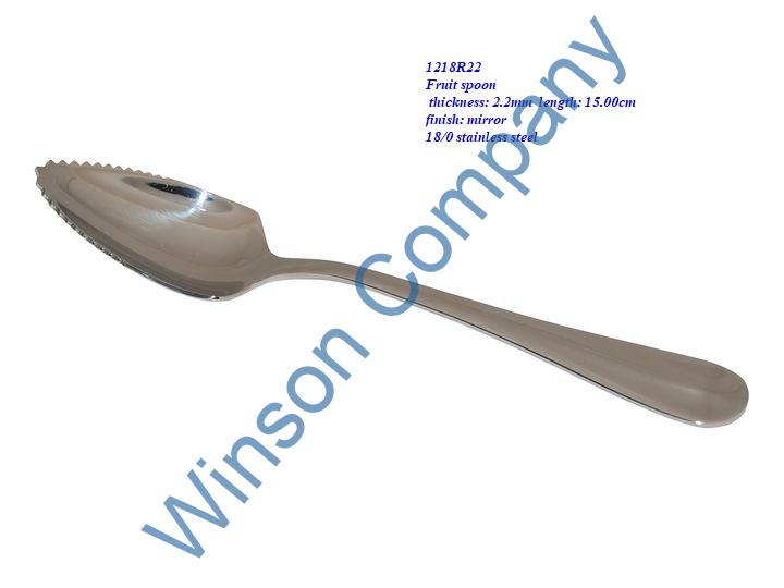 1218R22-Fruit spoon ← Previous Next → 1218R22 Fruit spoon thickness: 2.2mm length: 15.00cm finish: mirror Fruit spoon thickness: 2.2mm length: 15.00cm finish: mirror 18/0 stainless steel
