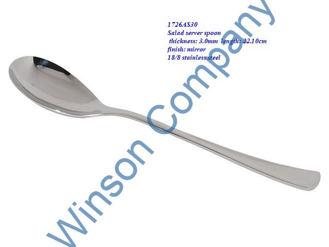 1726AS30-Salad server spoon ← Previous Next → 1726AS30 Salad server spoon thickness: 3.0mm length: 22.10cm finish: mirror Salad server spoon thickness: 3.0mm length: 22.10cm finish: mirror 18/8 stainless steel