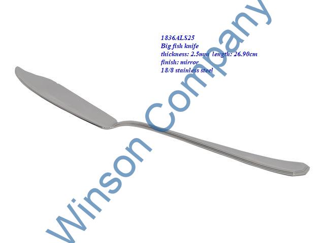 1836ALS25-Big fish knife ← Previous Next → 1836ALS25 Big fish knife thickness: 2.5mm length: 26.90cm finish: mirror Big fish knife thickness: 2.5mm length: 26.90cm finish: mirror 18/8 stainless steel