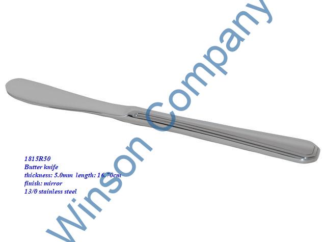 1815R50-Butter knife ← Previous Next → 1815R50 Butter knife thickness: 5.0mm length: 16.70cm finish: mirror Butter knife thickness: 5.0mm length: 16.70cm finish: mirror 13/0 stainless steel