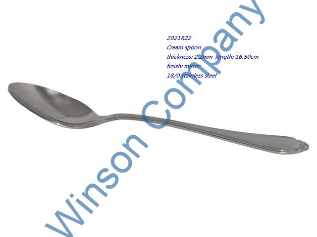 2021R22-Cream spoon ← Previous Next → 2021R22 Cream spoon thickness: 2.2mm length: 16.50cm finish: mirror Cream spoon thickness: 2.2mm length: 16.50cm finish: mirror 18/0 stainless steel