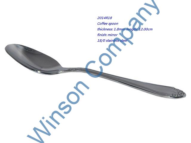 2014R18-Coffee spoon ← Previous Next → 2014R18 Coffee spoon thickness: 1.8mm length: 12.00cm finish: mirror Coffee spoon thickness: 1.8mm length: 12.00cm finish: mirror 18/0 stainless steel