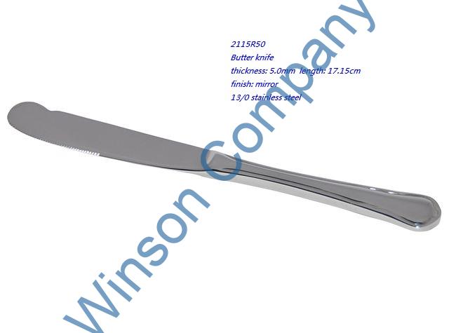 2115R50-Butter knife ← Previous 2115R50 Butter knife thickness: 5.0mm length: 17.15cm finish: mirror Butter knife thickness: 5.0mm length: 17.15cm finish: mirror 13/0 stainless steel