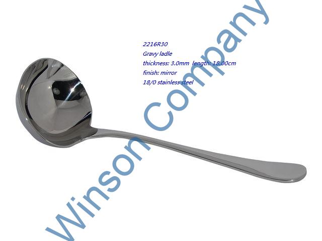 2216S30-Gravy ladle ← Previous Next → 2216R30 Gravy ladle thickness: 3.0mm length: 18.00cm finish: mirror 18/0 stainless steel