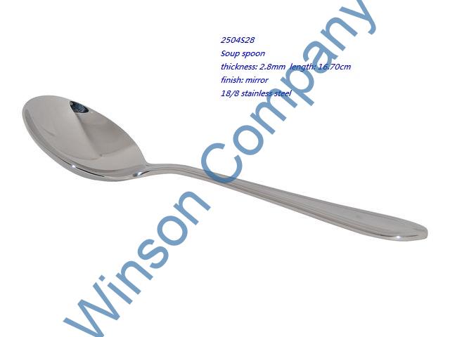 2504S28-Soup spoon ← Previous Next → 2504S28 Soup spoon thickness: 2.8mm length: 16.70cm finish: mirror 18/8 stainless steel