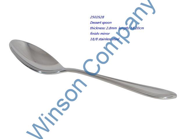 2502S28-Dessert spoon ← Previous Next → 2502S28 Dessert spoon thickness: 2.8mm length: 18.20cm finish: mirror 18/8 stainless steel
