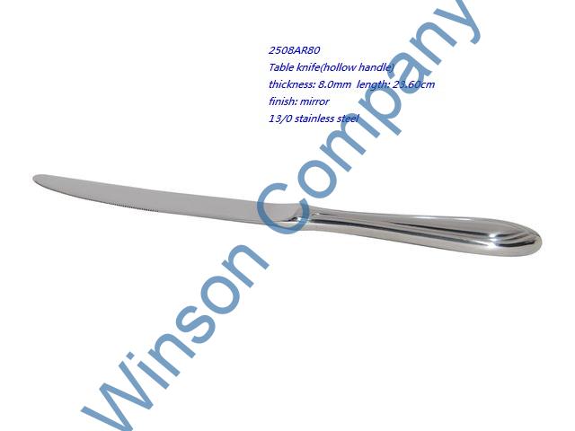 2508AR80-Table knife(hollow handle) ← Previous Next → 2508AR80 Table knife(hollow handle) thickness: 8.0mm length: 23.60cm finish: mirror 13/0 stainless steel