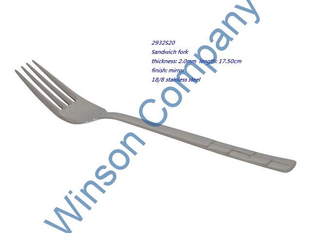 2932S20-Sandwich fork ← Previous Next → 2932S20 Sandwich fork thickness: 2.0mm length: 17.50cm finish: mirror 18/8 stainless steel