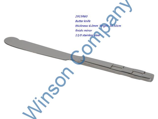 2915R60-Butter knife ← Previous Next → 2915R60 Butter knife thickness: 6.0mm length: 16.50cm finish: mirror 13/0 stainless steel