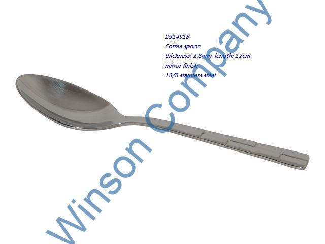 2914S18-Coffee spoon ← Previous 2914S18 Coffee spoon thickness: 1.8mm length: 12cm mirror finish 18/8 stainless steel