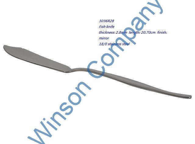 3036R28-Fish knife ← Previous Next → 3036R28 Fish knife thickness: 2.8mm length: 20.70cm finish: mirror 18/0 stainless steel