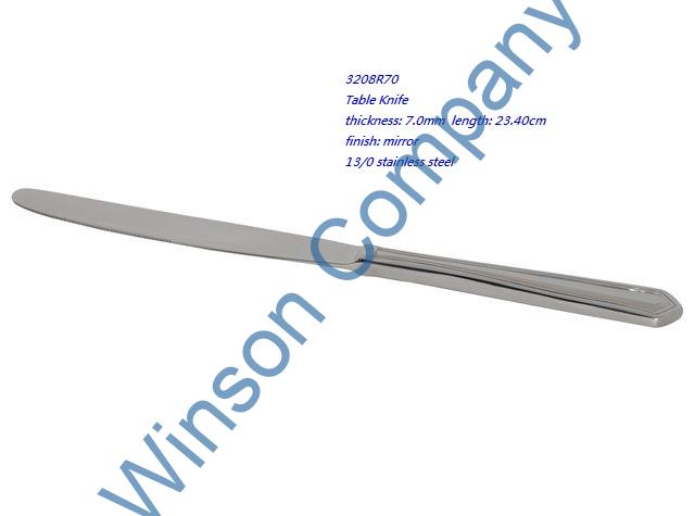 3208R70-Table Knife ← Previous Next → 3208R70 Table Knife thickness: 7.0mm length: 23.40cm finish: mirror 13/0 stainless steel