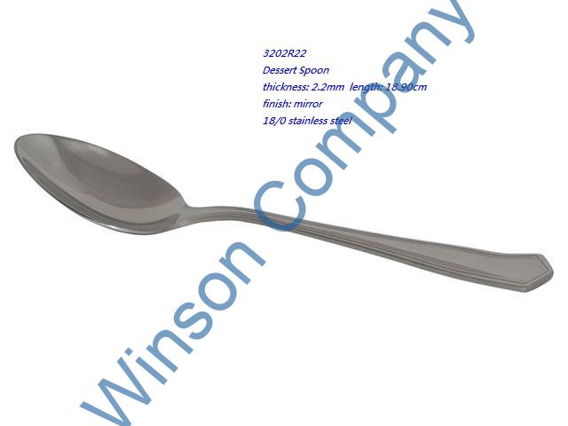 3202R22-Dessert Spoon ← Previous Next → 3202R22 Dessert Spoon thickness: 2.2mm length: 18.90cm finish: mirror 18/0 stainless steel