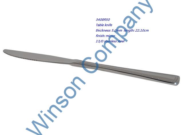 3408R50-Table knife ← Previous Next → 3408R50 Table knife thickness: 5.0mm length: 22.10cm finish: mirror 13/0 stainless steel