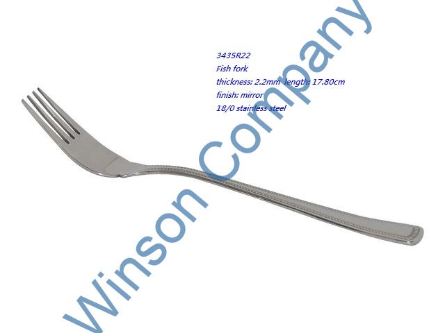 3435R22-Fish fork ← Previous Next → 3435R22 Fish fork thickness: 2.2mm length: 17.80cm finish: mirror 18/0 stainless steel