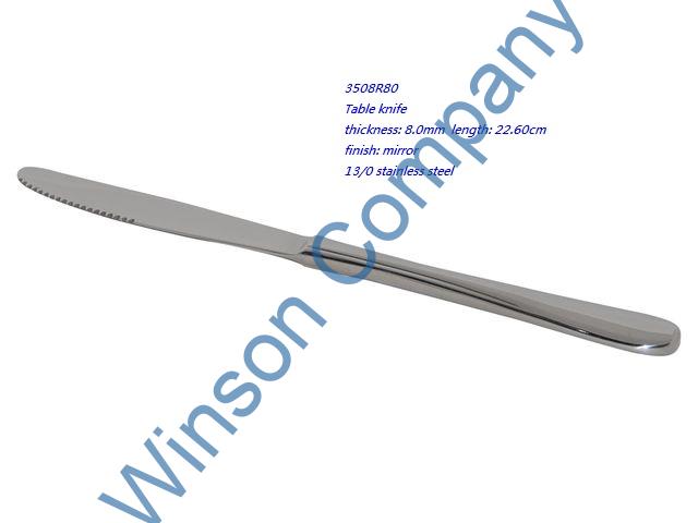 3508R80-Table knife ← Previous Next → 3508R80 Table knife thickness: 8.0mm length: 22.60cm finish: mirror 13/0 stainless steel