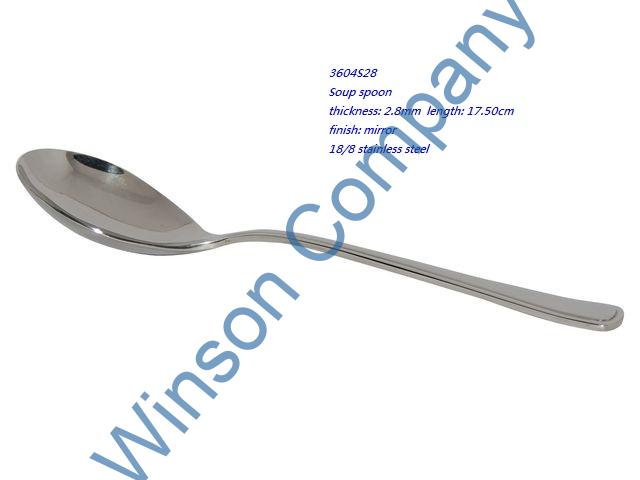 3604S28-Soup spoon ← Previous Next → 3604S28 Soup spoon thickness: 2.8mm length: 17.50cm finish: mirror 18/8 stainless steel