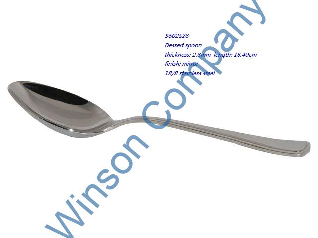 3602S28-Dessert spoon ← Previous Next → 3602S28 Dessert spoon thickness: 2.8mm length: 18.40cm finish: mirror 18/8 stainless steel