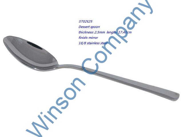 3702S25-Dessert spoon ← Previous Next → 3702S25 Dessert spoon thickness: 2.5mm length: 17.40cm finish: mirror 18/8 stainless steel