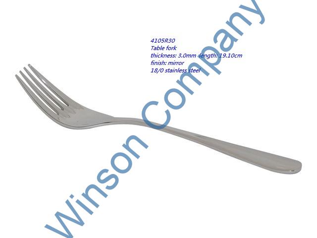 4105R30-Table fork ← Previous Next → 4105R30 Table fork thickness: 3.0mm length: 19.10cm finish: mirror 18/0 stainless steel