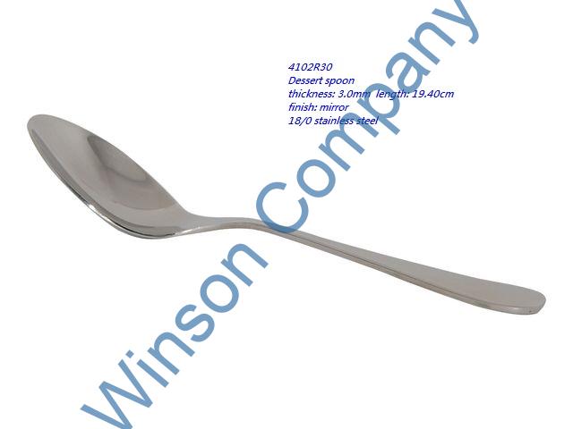 4102R30-Dessert spoon ← Previous Next → 4102R30 Dessert spoon thickness: 3.0mm length: 19.40cm finish: mirror 18/0 stainless steel