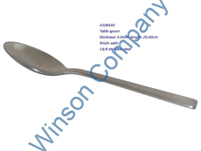 4306S40-Table spoon ← Previous Next → 4306S40 Table spoon thickness: 4.0mm length: 20.40cm finish: satin 18/8 stainless steel