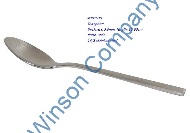4301S30-Tea spoon ← Previous Next → 4301S30 Tea spoon thickness: 3.0mm length: 15.60cm finish: satin 18/8 stainless steel