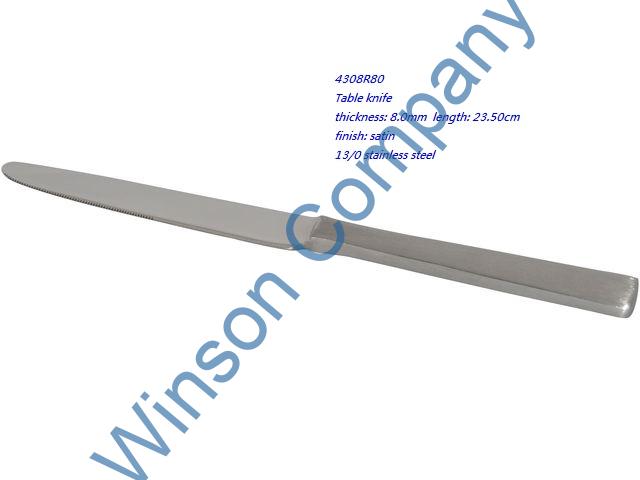 4308R80-Table knife ← Previous Next → 4308R80 Table knife thickness: 8.0mm length: 23.50cm finish: satin 13/0 stainless steel