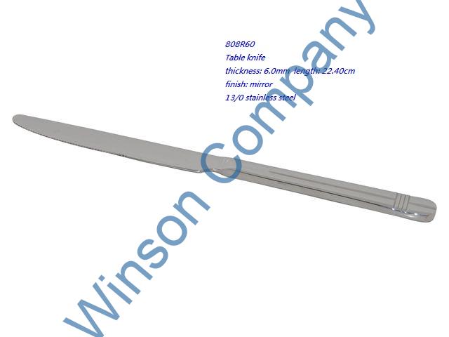 4808R60-Table knife ← Previous Next → 4808R60 Table knife thickness: 6.0mm length: 22.40cm finish: mirror 13/0 stainless steel