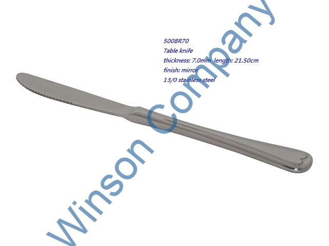 5008R70-Table knife ← Previous Next → 5008R70 Table knife thickness: 7.0mm length: 21.50cm finish: mirror 13/0 stainless steel