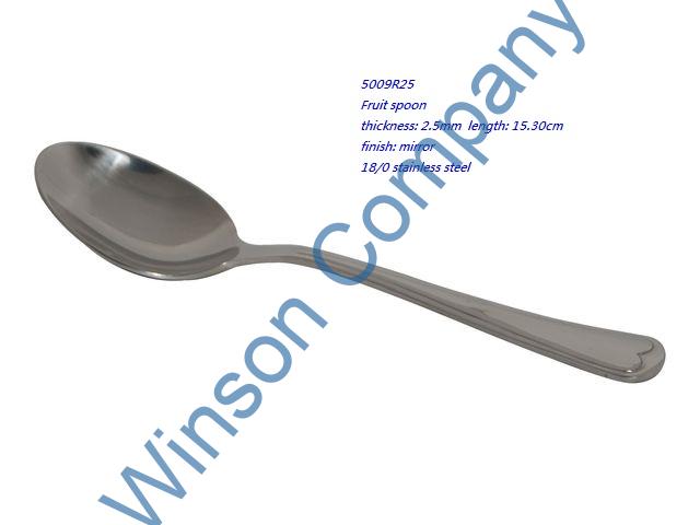 5009R25-Fruit spoon ← Previous 5009R25 Fruit spoon thickness: 2.5mm length: 15.30cm finish: mirror 18/0 stainless steel