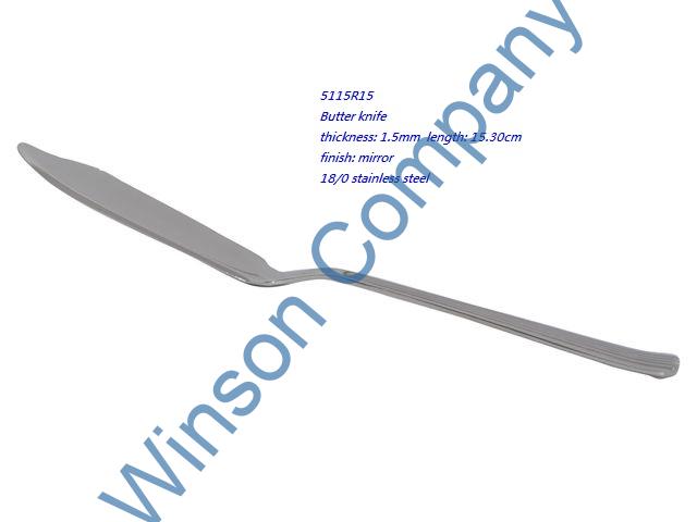 5115R15-Butter knife ← Previous Next → 5115R15 Butter knife thickness: 1.5mm length: 15.30cm finish: mirror 18/0 stainless steel