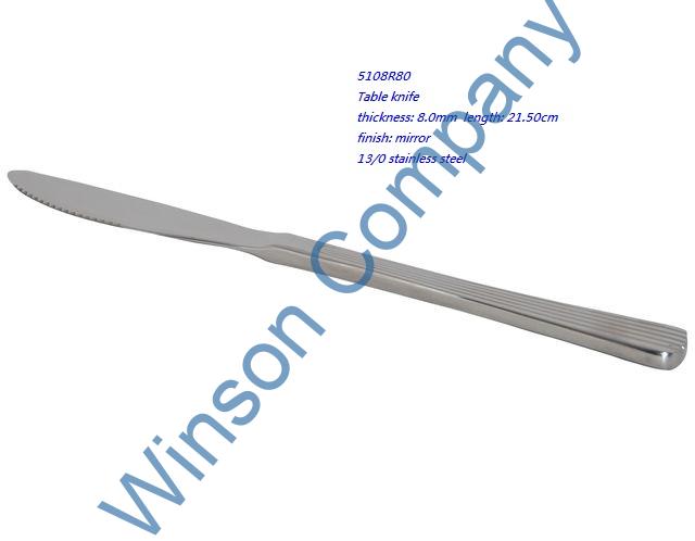 5108R80-Table knife ← Previous Next → 5108R80 Table knife thickness: 8.0mm length: 21.50cm finish: mirror 13/0 stainless steel