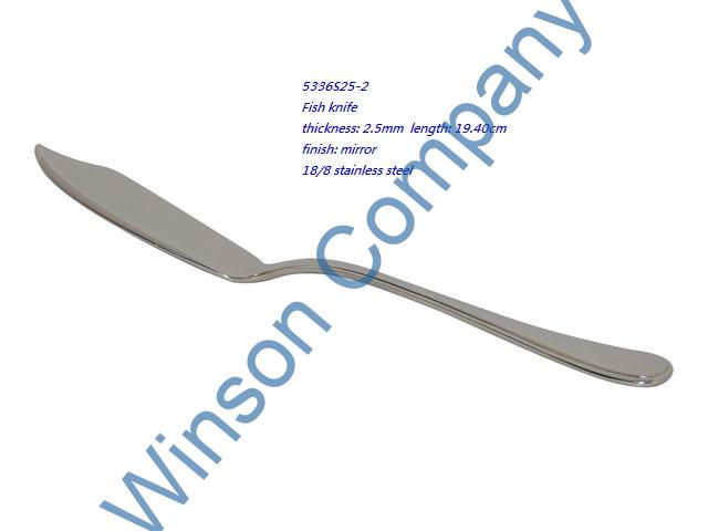 5336S25-2-Fish knife ← Previous Next → 5336S25-2 Fish knife thickness: 2.5mm length: 19.40cm finish: mirror 18/8 stainless steel