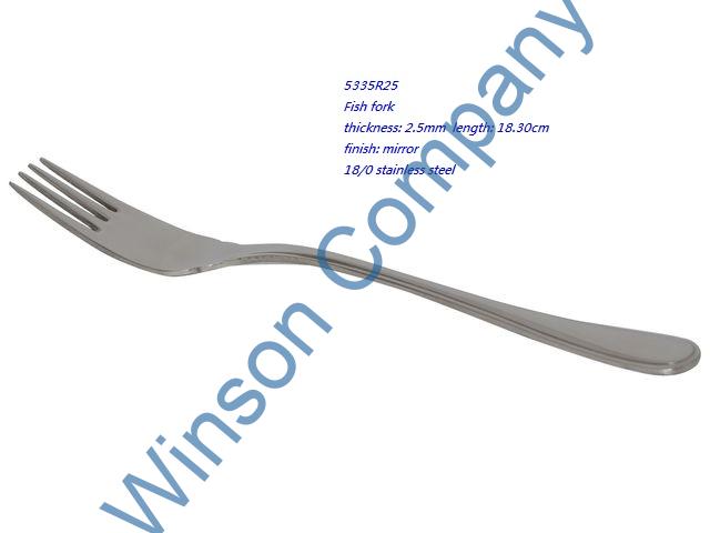 5335R25-Fish fork ← Previous Next → 5335R25 Fish fork thickness: 2.5mm length: 18.30cm finish: mirror 18/0 stainless steel