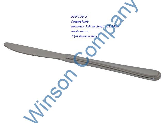 5307R70-2-Dessert knife ← Previous Next → 5307R70-2 Dessert knife thickness: 7.0mm length: 21.80cm finish: mirror 13/0 stainless steel