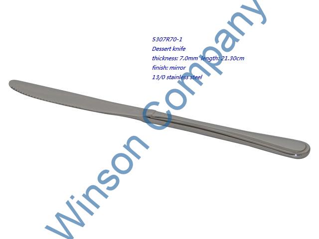 5307R70-1-Dessert knife ← Previous Next → 5307R70-1 Dessert knife thickness: 7.0mm length: 21.30cm finish: mirror 13/0 stainless steel
