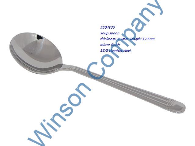5504S35-Soup spoon ← Previous Next → 5504S35 Soup spoon thickness: 3.5mm length: 17.5cm mirror finish 18/8 stainless steel