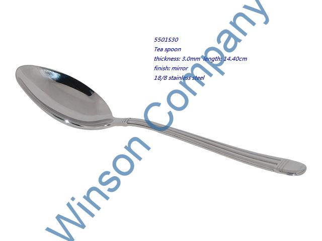 5501S30-Tea spoon ← Previous Next → 5501S30 Tea spoon thickness: 3.0mm length: 14.40cm finish: mirror 18/8 stainless steel