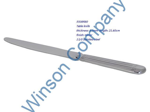 5508R80-Table knife ← Previous Next → 5508R80 Table knife thickness: 8.0mm length: 21.60cm finish: mirror 13/0 stainless steel