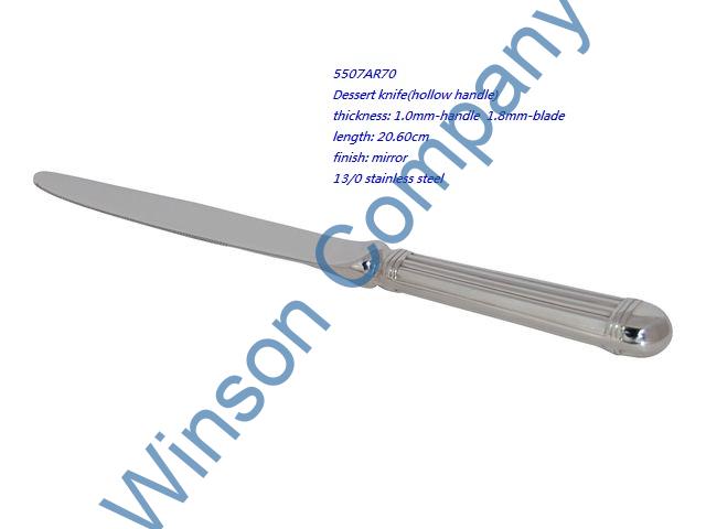 5507AR70-Dessert knife(hollow handle) ← Previous 5507AR70 Dessert knife(hollow handle) thickness: 1.0mm-handle 1.8mm-blade length: 20.60cm finish: mirror 13/0 stainless steel