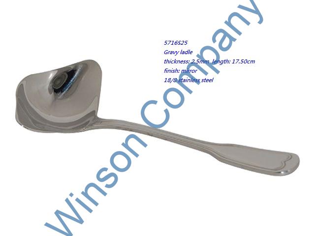 5716S25-Gravy ladle ← Previous Next → 5716S25 Gravy ladle thickness: 2.5mm length: 17.50cm finish: mirror 18/8 stainless steel