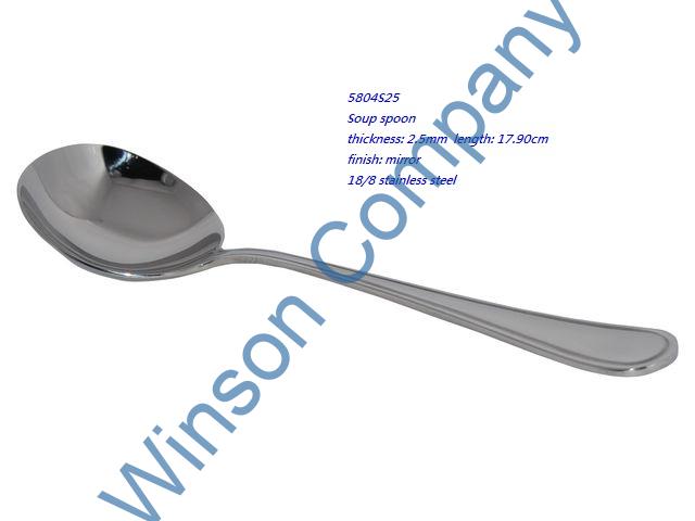 5804S25-Soup spoon ← Previous Next → 5804S25 Soup spoon thickness: 2.5mm length: 17.90cm finish: mirror 18/8 stainless steel