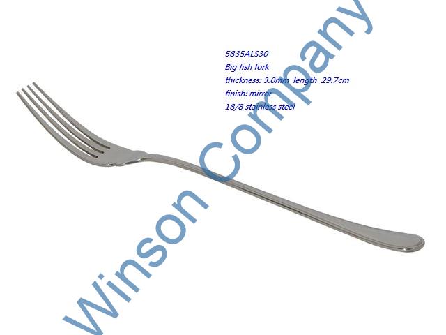 5835ALS30-Big fish fork ← Previous Next → 5835ALS30 Big fish fork thickness: 3.0mm 29.7cm length finish: mirror 18/8 stainless steel