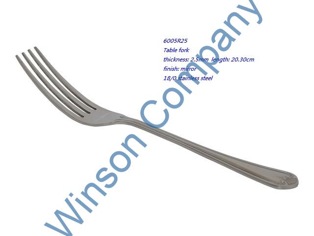 6005R25-Table fork ← Previous Next → 6005R25 Table fork thickness: 2.5mm length: 20.30cm finish: mirror 18/0 stainless steel