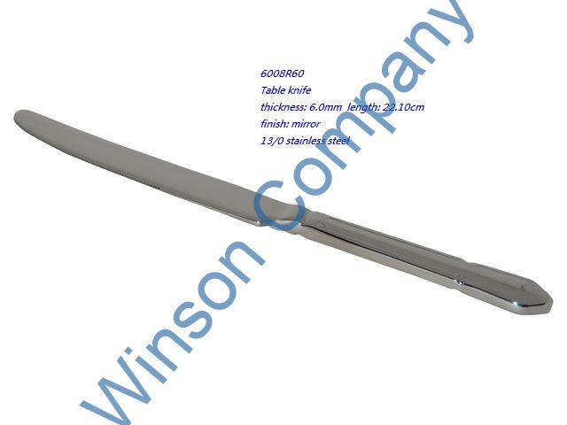 6008R60-Table knife ← Previous Next → 6008R60 Table knife thickness: 6.0mm length: 22.10cm finish: mirror 13/0 stainless steel